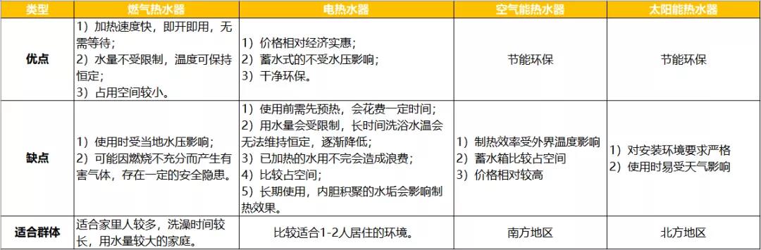 综上,四种类型热水器的对比总结如下: